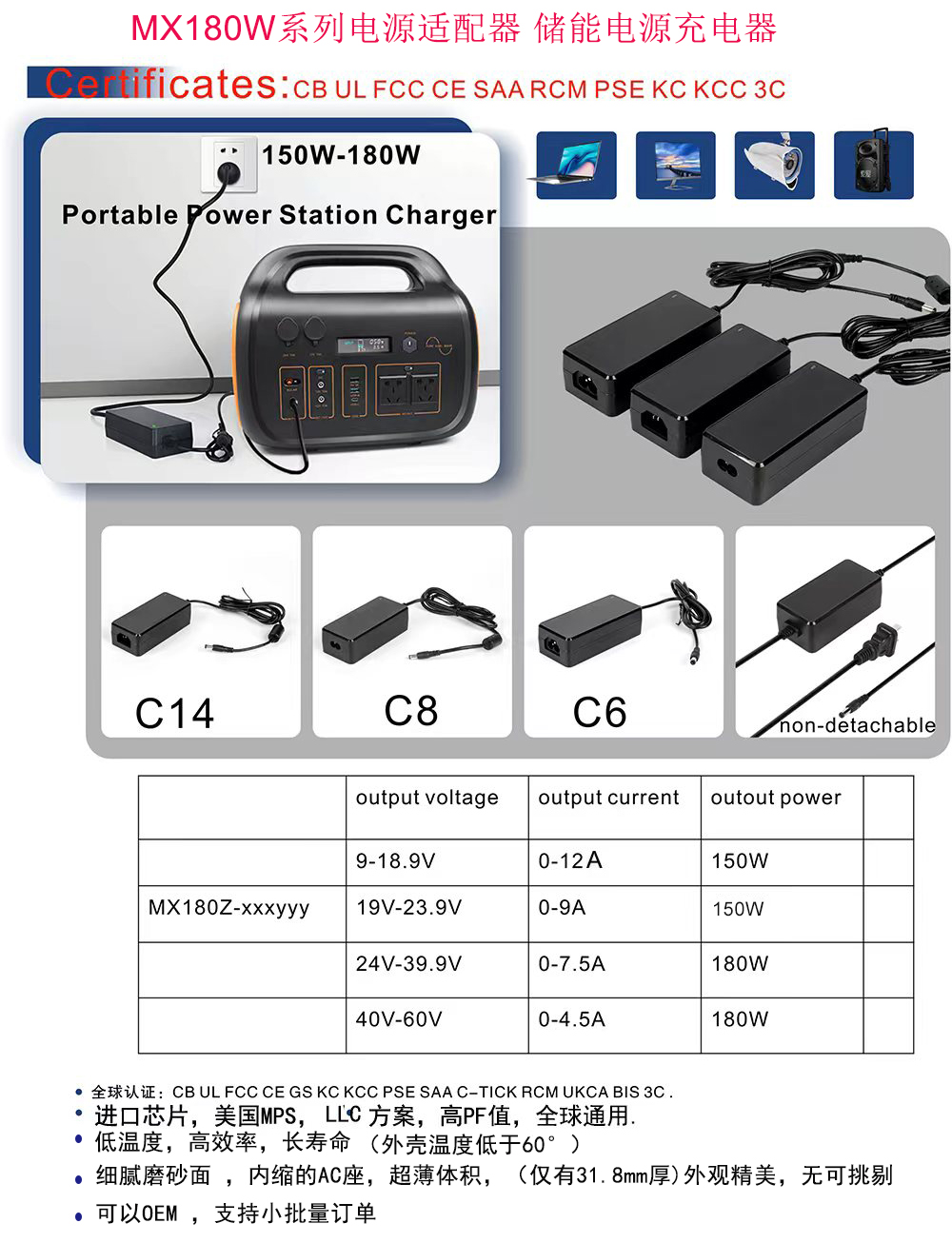 MX180W系列電源適配器 ,專業用于給儲能電源充電,已經通過了CB UL FCC CE KC KCC PSE SAA C-TICK RCM 3C認證